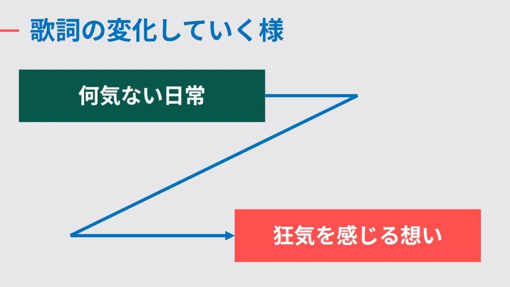 しかし、歌詞はどんどんエスカレートしていきます。何気ない「日常」を切り取っていた歌詞が、少し恐怖を感じるような歌詞へと変化していきます。楽曲の歌詞がある部分での終盤、このような歌詞があります。