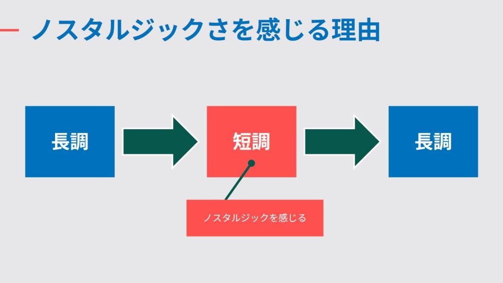 図に簡単に表してみましたが、半音ずつ下げる事で短調になる部分で「ノスタルジーだな」と感じる算段です。良く計算されているなと思います。半音ずつ下げる技法は昔からありますが、楽器の足し算引き算で、上手くノスタルジックさを引き出していると思います。これは非常に面白いギミックだと思います。